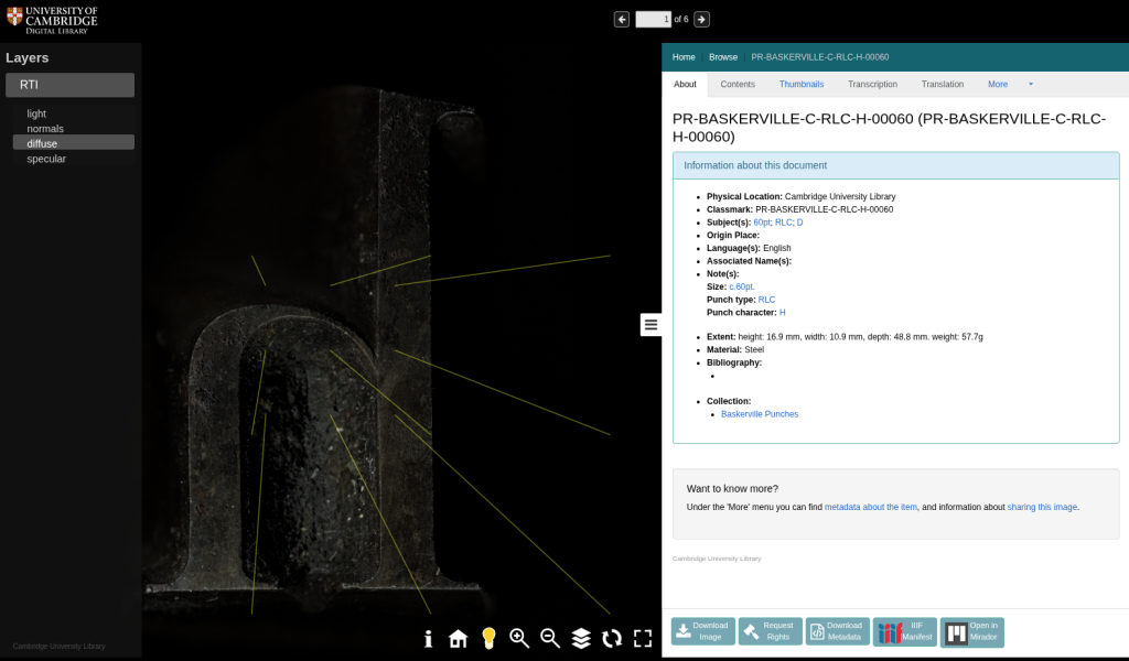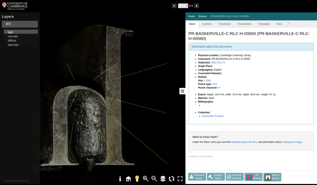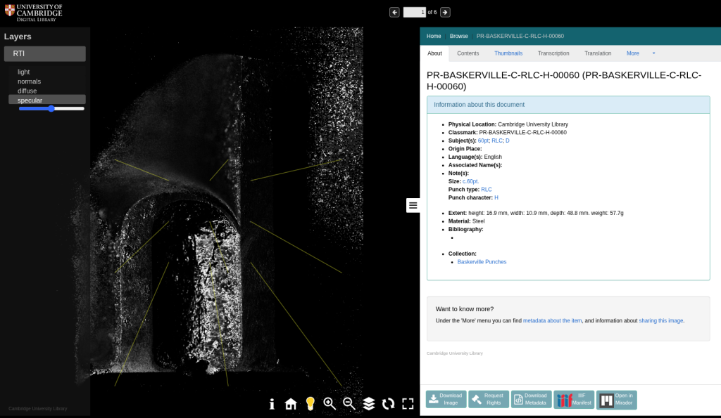 Below is a demonstration of the RTI viewer in the Cambridge Digital Library, using the Baskerville Punch for the letter “h” as an example. The viewer allows users to move the light source, switch between surface representations, and adjust specular and diffuse reflection parameters in real time.