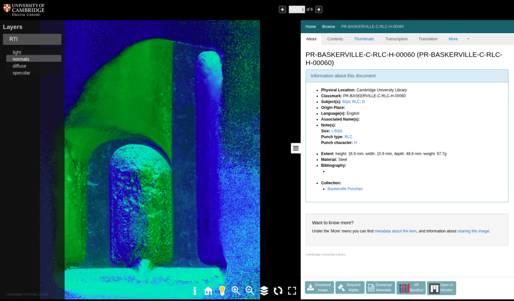 The Baskerville Punches provide the first example of this, showing how interactive relighting can reveal fine details that static images can’t. Developed as part of the Cambridge Digital Collections Platform (CDCP), this work builds on open-source collaboration and shared standards, helping to support not only CUDL but also the wider cultural-heritage community. Looking ahead, this framework lays the groundwork for incorporating additional display formats, such as 3D and multispectral imaging in the future.